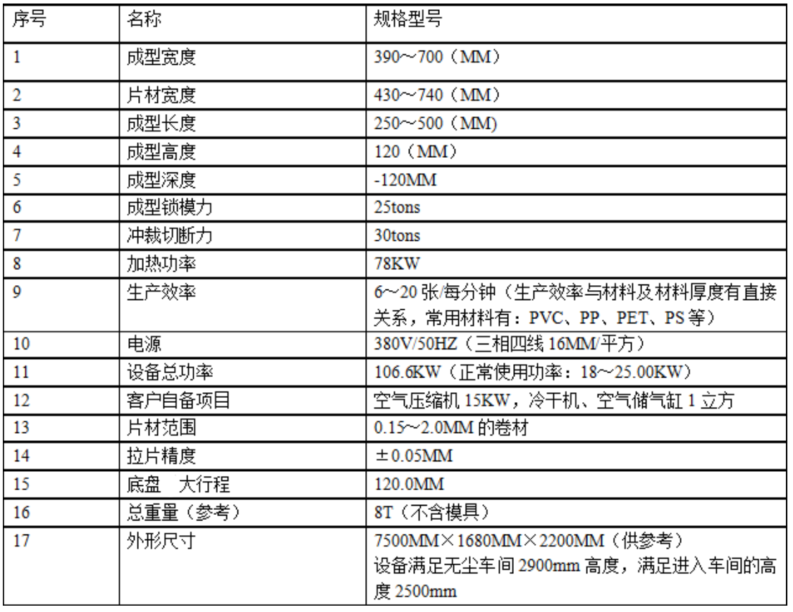 产品工艺:自动上料→双段上下加热→正负压成型→冲裁→分解堆叠→废料自卷系统