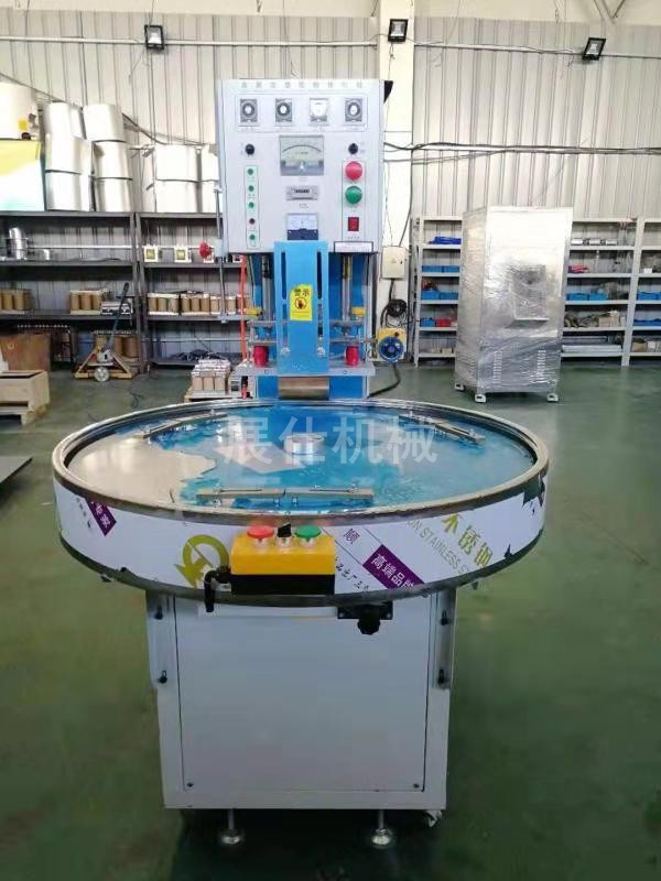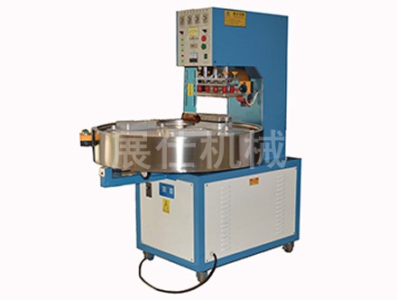自动转盘式高频机使用时可根据吸塑包装的产品尺寸大小与焊接面积,来决定设备功率与一模出几个产品,机器的产量大约为3500-4500次/8小时,分二工位转盘与三工位转盘可选。
