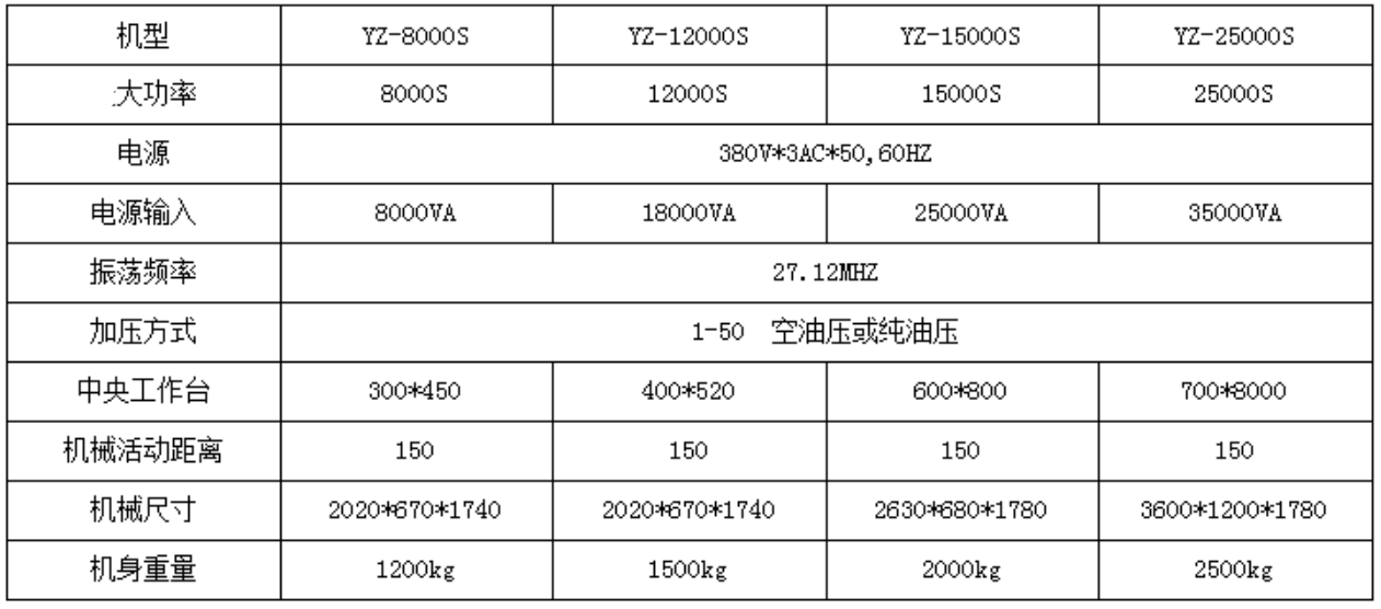 采用滑台式或多工作位转盘自动推动,定位准确,功率范围12~50KW, 大功率高周波熔断机较大压力范围50吨油压,大工作面积可达到800x1000mm,熔断切边圆滑,手感好,5557PL美式灵敏火花保护装置,防止模具烧捐。