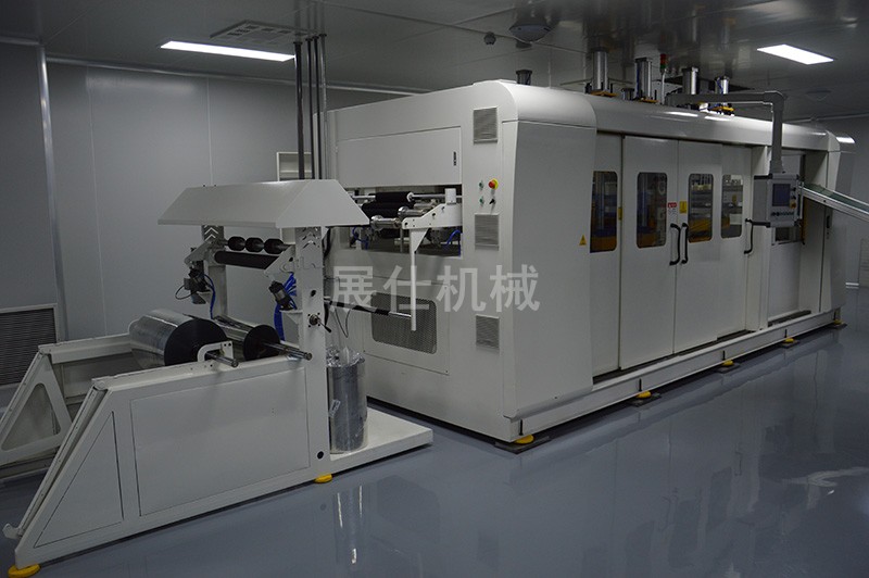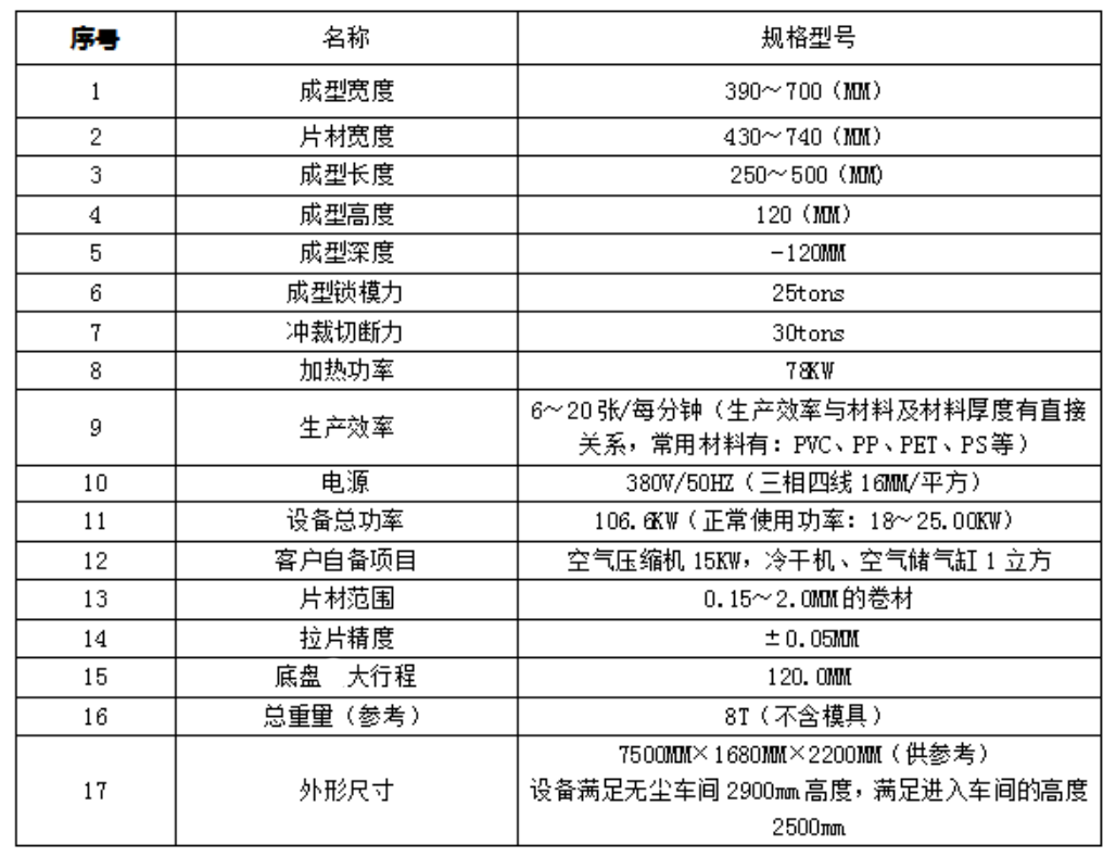 产品工艺:自动上料→双段上下加热→正负压成型→冲裁→分解堆叠→废料自卷系统。