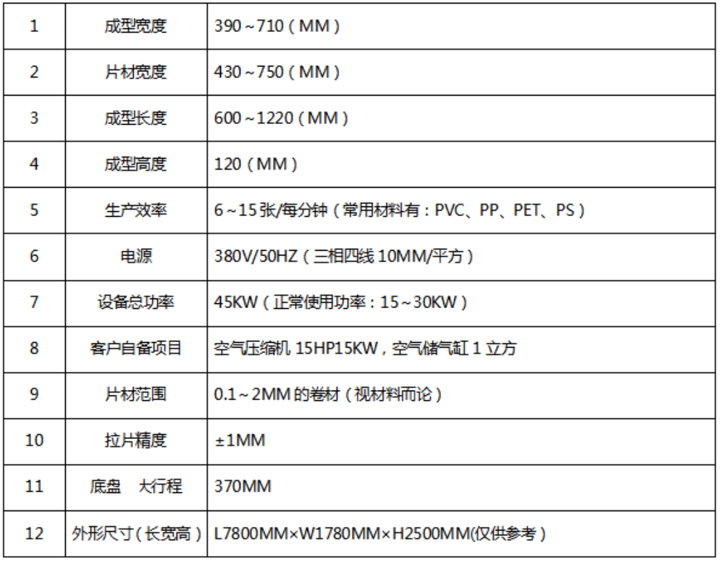 一、概述:这是一款普通的电脑控制高速吸塑成型机。工作的原理是将材料(HIPS PS PP PVC PET ABS)通过加热与模具真空成型的过程。它不能独立完成从材料到成品的全过程。在产品的生产过程中要配合精密四柱液压裁断机进行整个吸塑工艺的完成。二、用途:此款标准设备的成型面积1220*710mm,所做的产品用于不同领域(文教用品、电子产品、各种食品的、玩具、医疗产品)内的产品的吸塑包装。三、设备技术参数: