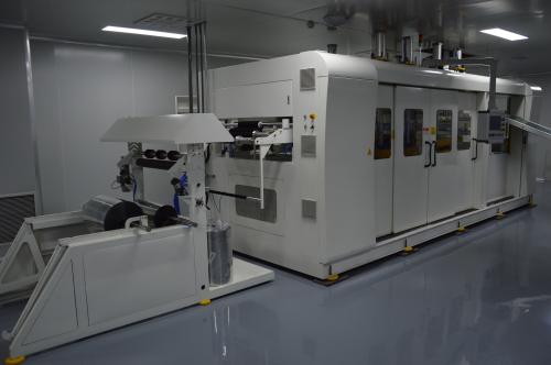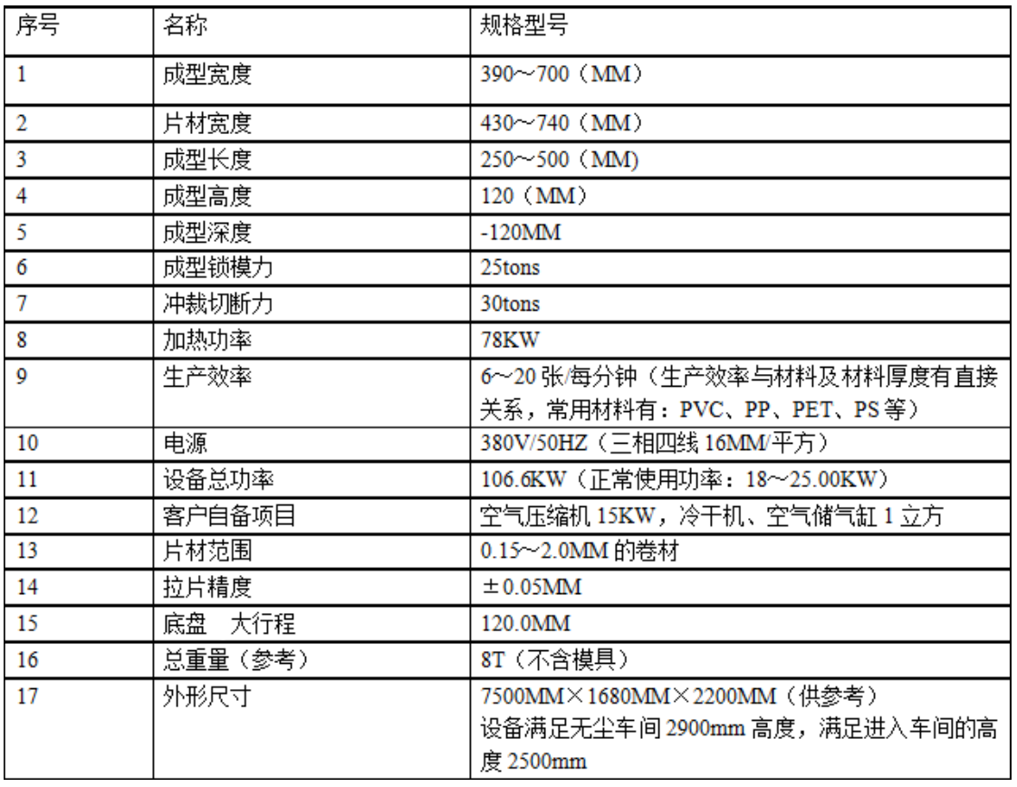 产品工艺:自动上料→双段上下加热→正负压成型→冲裁→分解堆叠→废料自卷系统