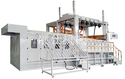板材放料——自动上料——板材运送——板材加热——烘烤防锤托板——板材吹胀——真空吸塑成型—辅助成型— 冷却定型——半成品返回上料区——自动下料