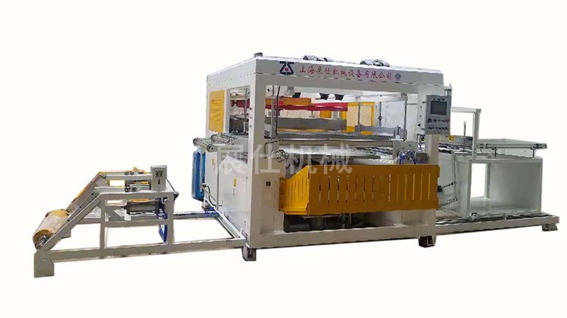 自动上料-泡沫板滑进去到成型工位—自动拉料—底模上升—压框下降真空一次—加热炉移进来烤片,加热时间到—自动退炉—自动真空成型—成型产品拉至卸料区,自动切割。
